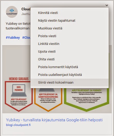 Omia päivityksiä voi liittää Kokoelmiin päivityksen oikean yläkulman valikosta, kohdasta Siirrä viesti kokoelmaan.